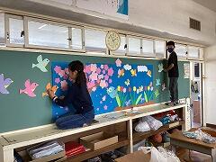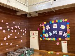 6年生の教室をのぞいてみたら,教卓の上に飾られたお花だけが寂しそうにしていました。図書室の前には,思い出の一冊のカードが飾ってありました。卒業生は元気かな?