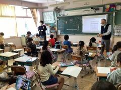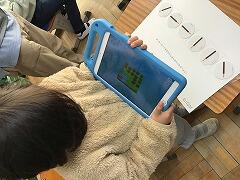 1年生が,ICT支援員の中村さんに教わりながら,プログラミング学習に楽しそうに取り組みました。『GLICODE(グリコード)®』は,おかしをルールに従って並べるだけで遊びながらプログラミングの基礎的な考え方を学習できるアプリです。