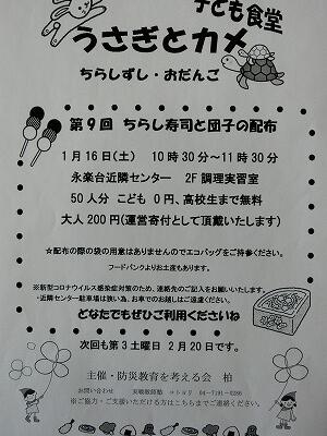 1月16日(土)に,永楽台近隣センターで子ども食堂「うさぎとかめ」さんが,開催されるそうです。今回は,ちらし寿司とお団子が配付されます。詳しくは,添付のチラシをご覧ください。