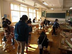 図工でのこぎりを使って作品を作ります。今日は,のこぎりの切り方練習。足でしっかり押さえながら,のこぎりの切り方(刃の向きや動かし方)を工夫しています。