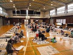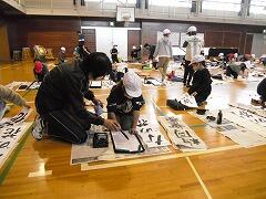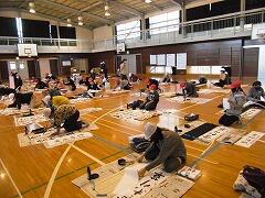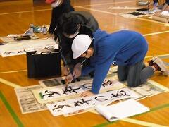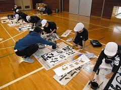 昨年度は書初めを中止したので,4年生にとっても今年は初めての書初めです。体育館で学年で一緒に,しかもプロの先生に教わる!と緊張の面持ちで頑張っていました。