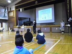2年生が町たんけんで発見したことをクイズなどにまとめ,1年生に発表しました。