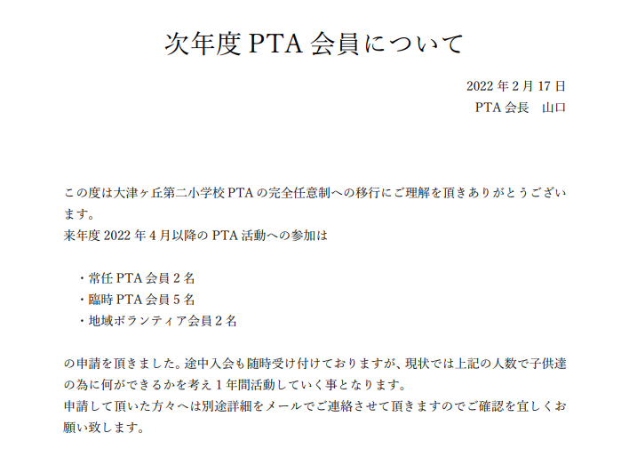 次年度PTA会員について