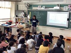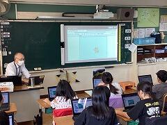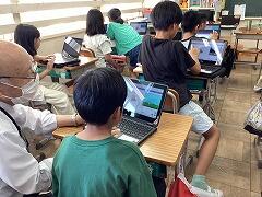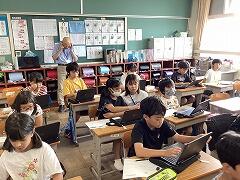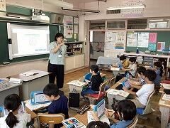 同じく4年生で,Scratch(スクラッチ)を使ったプログラミング体験の学習も同日に行われました。ICTアドバイザーの中村先生に,プログラムで制御しているキャラクターの動かし方を教わりました