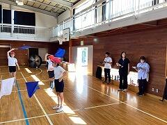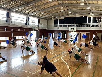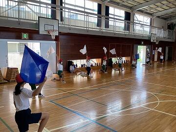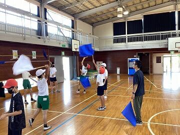 中学年ダンスリーダーに続いて,高学年でも運動会の「表現」の練習が始まりましたまずは6年生が,フラッグの動きと一人で行う基本技を練習しました