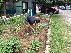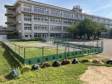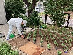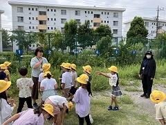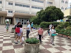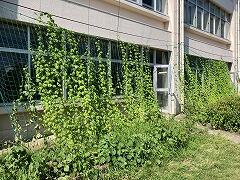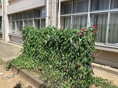 花壇では,用務員の竹内さんやたんぽぽ2組の岩﨑先生が植物の手入れをしていました。4年生が植えたツルレイシ,工事現場の制限エリア内となっていますが,元気に育って順調にグリーンカーテンを作っています