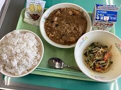 こうも暑いと,しっかり食べて熱中症予防です麻婆茄子とごはん,バンサンスウをモリモリ美味しく食べて,下校後も元気に過ごせるようにしていきます