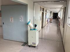 Sigfyでもお知らせしましたが,3・4階は特に暑くなるので,4階図工室(写真左)・3階PC室(写真中央)を「待合室」として,冷房を効かせて開放しております。また,3階中央階段付近にスポットクーラー(写真右)を設置しておりますので,面談前やすき間時間にご活用ください