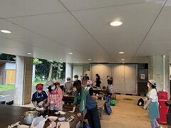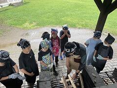 創作活動を終えて,野外炊飯場へ移動しました。火おこしを体験して,いよいよカレーライス作りに入ります引率の先生方に加えて,本日の勤務を終えた「応援部隊」の先生方が合流して,子どもたちのカレーライス作りをサポートします