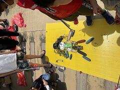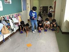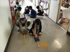 わんぱくタイムは外に行けないため,校舎内で過ごしました。3年生は理科の学習で使用したゴムの力で動く車で競走です正面どうしでぶつけて遊んでいる人,ちがーうっ
