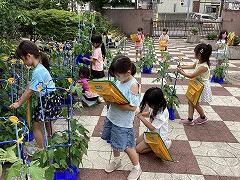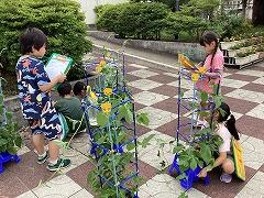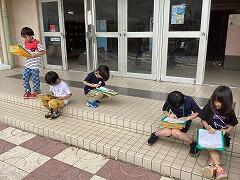 昇降口前では1年生がアサガオを観察していました。iPadで写真も撮っていますが,今日はワークシートに手書きで記録しました