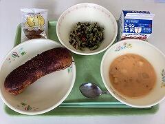 今日の給食は二小ちゃんたちにも大人気のココア揚げパンとキャロットポタージュ,各クラスで美味しくいただきましたおかわりする子も多かったです