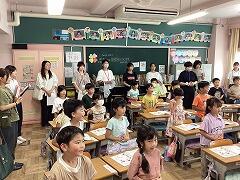 東部地区の幼稚園・保育園・小学校の先生方を大津二小にお招きして,「幼保こ小連絡会」を開催しました。1年生の昼休みの様子を見学してもらった後に,5時間目の1年1組の音楽の授業を参観していただきました