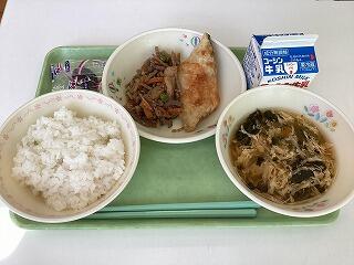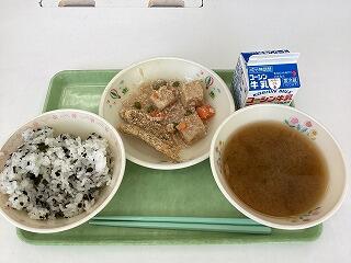 わかめごはんがとにかく大人気でしたごはんが進むので,おかずも進み,きびなごフライもそぼろ煮も美味しそうにほお張っている二小ちゃんたちでした