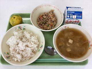 <ごぼう入り鶏そぼろ しめじと豆腐のみそ汁 ごはん 牛乳 みかん>