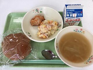 <パプリカチキン ポテトのチーズ煮 豚肉と豆のスープ 胚芽パン 牛乳>