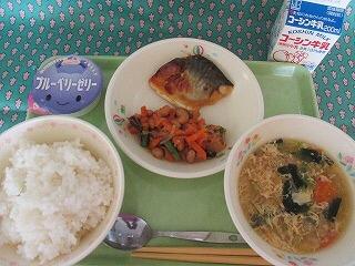 <さばのかぼちゃ味噌焼き 五目豆 むらくも汁 ごはん 牛乳 ブルーベリーゼリー>