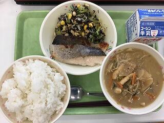 今日は,サーモンのかすづけ・大豆とひじきのあまずあえ・ゴマ仕立てみそ汁