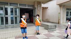 児童会によるあいさつ運動。ソーシャルディスタンスをとりながら,登校してくるニコッピ達に笑顔であいさつしてくれています。