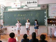 1学期の終わりに引き続き,児童会のみなさんが昇降口で「あいさつ運動」を行ってくれています。コロナ禍のため,大きな声でのあいさつはお願いできませんが,今月の目標「暑さに負けない 熱いつながりをつくろう」のとおり,目と目を合わせたあいさつがいいですね。