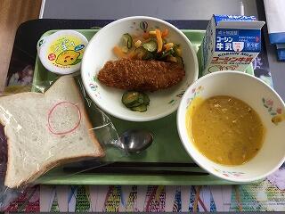 1学期最後の給食は食パン・ホキフライ・パンプキンポタージュ・はちみつレモンゼリー!