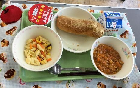 今日は,きなこあげぱん・マカロニサラダ・チリコンカーン・ヨーグルト