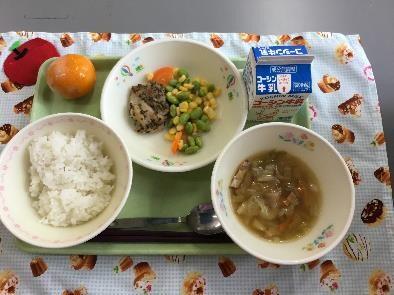 今日は,ハーブグリルチキン・えだまめとコーンのサラダ・キャベツと
