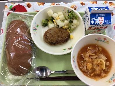 今日は,こくとうぱん・ハンバーグBBQソースかけ・ブロッコリーと