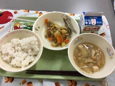 今日は,きびなごのからあげ・カレーにくじゃが・ぐだくさんみそ汁・