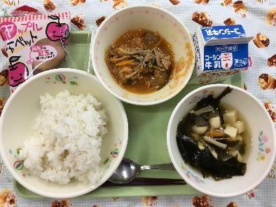 今日は,ぶたキムチどん・うずらたまごとわかめのスープ・冷凍リンゴ