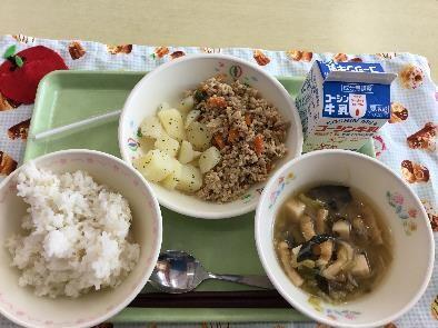 今日は,ごもくとりそぼろとこふきいも,きりぼしだいこんの味噌汁
