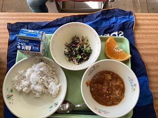 今日は,チキンとトマトのカレー・ブロッコリーとひじきのサラダ・いよかん