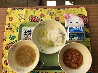 ごはん・肉どうふ・じゃがいもとわかめのみそ汁・黒糖大豆という和食メニューでした。