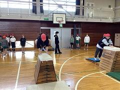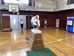 5年生の体育は跳び箱です。1組はサーキットトレーニングで,2組はなわ跳びでウォーミングアップを済ませてから,今日新たに「抱え込み跳び」の練習に取り組みました