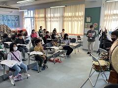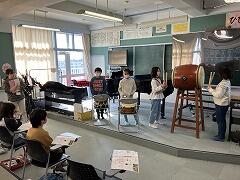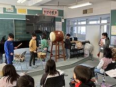 3年生の音楽では,和楽器を取り入れたリズム作りの発表会を行いました和太鼓の力強い音の響きに,聴いているみんなからの元気なかけ声が合わさって,お祭りのワンシーンのようでした