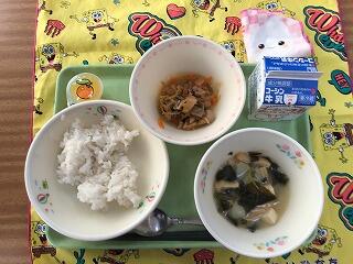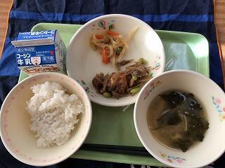 今日は,山口県の郷土料理のチキンチキンごぼう・3色そくせきづけ・豆腐とあおさの味噌汁