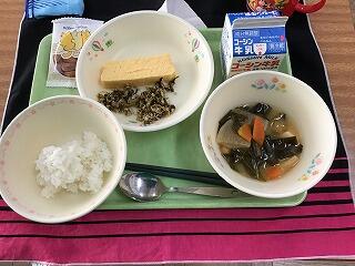 今日は,大根葉の手作りふりかけ・あつやきたまご・柏大根の味噌汁・スナックアーモンド