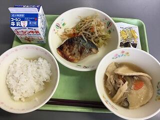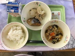 今日は,さばのみそづけやき・うめおかか和え・せんべい汁・黒糖大豆でした!