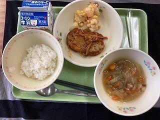 今日は,とうふハンバーグ・コーンポテト・ABCマカロニ入りスープでした!