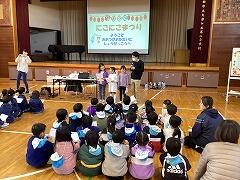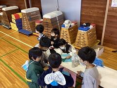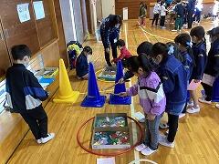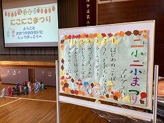 風早幼稚園とあいみ保育園の年長さんをお招きして,1年生の二小ちゃんたちが用意したおもちゃで遊んでもらう「おまつり」を開催しました。どんぐりごまや落ち葉のトランプなど,生活科「あきとなかよし」で学習したおもちゃで,楽しんでもらうことができました