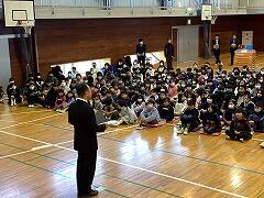いよいよ今日は2学期の終業式,77日間の総まとめの日ですはじめにこども県展などの表彰を行い,飯田校長先生と生徒指導担当の岩﨑先生からのお話を聞きました。