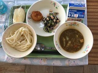 今日は,カレーうどん・いももち・ハムとひじきのあえもの・りんご
