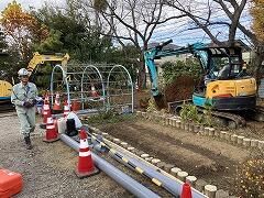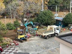 先週から配膳室近くの花壇の周囲で工事が行われていますスクリレのお手紙でも案内させて頂きましたが,災害時にマンホールを使ったトイレを設営できるように,新たに下水道管につなぐ工事です