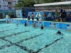 加藤さんによるデモンストレーションの後は,泳ぎ自慢の4年生二小ちゃんとの「勝負」加藤さんが1往復(50m)泳ぎ切る間に4年生が片道(25m)を泳ぎ切ったら勝ち,というルールでした。結果は…何と,泳ぎではなく25mを水中ダッシュで「走り」切った4年生の勝利となりました