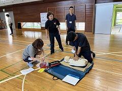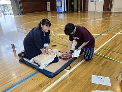 心肺蘇生のための胸骨圧迫とAED使用方法について動画を視聴した後に,訓練用のAEDと人形で胸骨圧迫を練習しました。胸骨圧迫をする人・119番をする人・AEDを持ってくる人と,チームワークが大切ですね