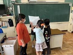5時間目,4年1組では子どもたちがゴミ袋を持って教室内を動いていました。理科「とじこめた空気」の学習で,実際にゴミ袋の中に空気を閉じ込めて,触ってみたり押してみたりとその感触を確かめていたんですねエアコンや天井の扇風機の風を集めようとしている姿が面白かったです