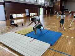 所変わって体育館では,6年2組がマット運動の学習に取り組んでいました。グループで選んだ音楽をChromebookで流しながら,色々な技を盛り込んだ集団演技の練習に励みます。