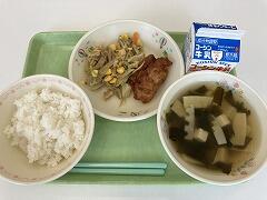 <鶏肉の唐揚げ 油揚げとごぼうの和え物 若竹汁 ごはん 牛乳>