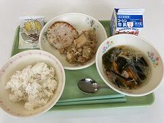<たこ入りすり身焼き 生揚げとキャベツのみそ炒め わかめの吸い物 ごはん スナックアーモンド 牛乳>