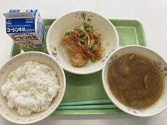 <いかのかりん揚げ 枝豆入りごま和え いも団子汁 ごはん 牛乳>